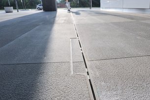 Unlike the Lamina Fix drainage channel with its fixed installation height, the Lamina model is a slotted drainage channel with integrated height adjustment. Whether for draining open spaces or façades, the height-adjustment feature means the Lamina can be smoothly raised or lowered in line with the structural conditions on site. Accumulating precipitation is collected through a slot with an inlet width of 10mm and securely directed into the channel body. From here, the water is guided to the dewatering points and can simultaneously drain away through the drainage slots into the surrounding fill or, depending on the installation situation, into the dewatering level below. We supply the Lamina either in stainless steel or hot-dip galvanised steel, ex works in a length of 1,000mm. The overall width of the channel measures 80mm. The overall height of the channel can be smoothly adjusted between 90mm and 115mm. Compatible flush boxes for servicing the channel as well as end and corner pieces can be freely combined with the height-adjustable Lamina slotted channel.