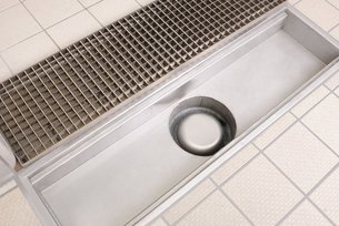 The channels with an inlet width of 160mm feature nozzles in DN 100. From an inlet width of 250mm, nozzles can be supplied in either DN 100 or DN 200. The integrated 110mm or 204mm-wide floor drains are fitted with an odour trap and screen. In addition to this, we offer drains with vertical or horizontal nozzles that sit on the base panel with their flange.