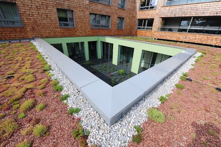 With their grey aluminium colour, the edge profiles appear modern and classy. The powder-coating of the parapet coverings creates a low-maintenance surface and ensures a uniform colour. These characteristics are particularly advantageous when it comes to the landscaped roof of the ground floor. Here the residents of the care home can look out directly onto the gravelled and green roof surface.