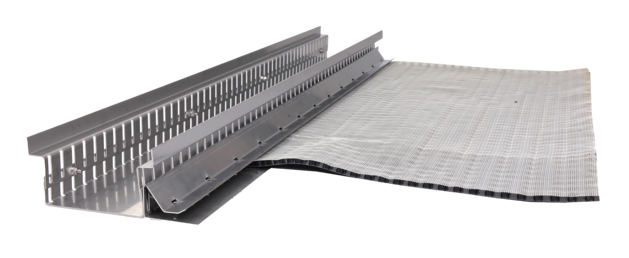 Unser Drainagematten-Adapter Connectus ist die geeignete Ergänzung zu unserer Drainagerinne Hydra zur Befestigung von Drainagematten direkt am Rinnenkörper. Der Adapter wird außen an der Rinne angeschraubt und dient damit als längsseitig fixierendes Element. Drainagematten mit einer Dicke zwischen 8 mm und 16 mm werden anschließend einfach in den Adapter eingeschoben und mittels kleiner Widerhaken nahtlos an der Rinne gehalten. Dadurch kann die Matte anschließend leichter, schneller und zielsicherer verlegt werden, da sie vom Adapter in Position gehalten wird. Neben dem Verrutschen der Matte verhindert das Zubehörteil das Einfallen von Kiesel, Dreck oder ähnlichem und stellt damit eine bestmögliche Drainage sicher. Zu dieser trägt auch die Trichterform des Adapters bei, welche anfallenden Niederschlag über zur Hydra passende Löcher zielgerichtet zur Drainagematte ableitet.