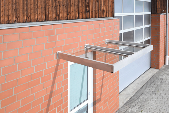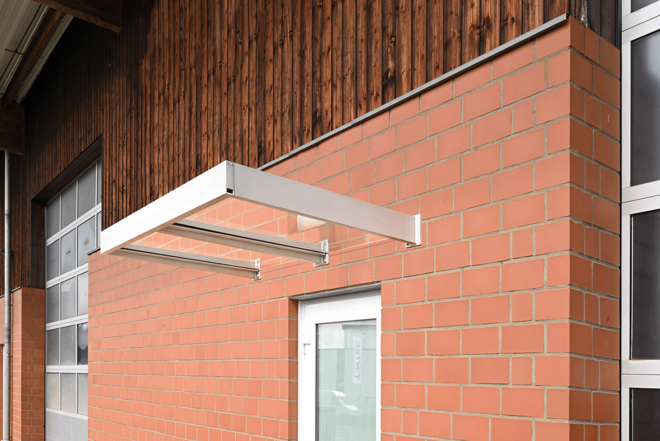 Qu’il s’agisse de votre domicile ou de votre entreprise, vous ne souhaitez sûrement pas laisser vos visiteurs attendre sous la pluie devant votre porte. Avec nos auvents haut de gamme, nous vous proposons des abris à la fois fonctionnels et esthétiques pour une protection efficace au-dessus de votre entrée. Notre système se compose d’une armature robuste en aluminium de 120 mm de haut et d’un vitrage en verre de sécurité feuilleté de 12,76 mm d’épaisseur. Nos marquises sont tout simplement fixées au-dessus de la porte d’entrée à l’aide de plaques soudées à visser sur la façade.