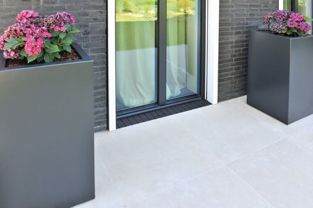 Neben den Innenräumen dient der großzügige Außenbereich den Bewohnern als privater und begrünter Rückzugsort. Eine Pergola überspannt die seitlich ans Haus angrenzende Terrasse, die in den Poolbereich übergeht. Ein Holzdeck fügt sich in die Terrassenfläche aus großformatigen, hellen, beigefarbenen Fliesen ein. Um Niederschlagswasser von der Fläche sowie an der Fassade sicher abzuleiten, war ein ausreichendes Entwässerungssystem gefordert. Dränagerinnen, die in Monokornmörtel eingelassen werden können, sollten an sämtlichen Tür- und Fensterelementen des Erdgeschosses zum Einsatz kommen. Damit ein schwellenloser Übergang zwischen Innen und Außen besteht, war eine minimale Aufbauhöhe gefordert. Darüber hinaus sollte sich das System optisch an das architektonische Konzept anpassen.