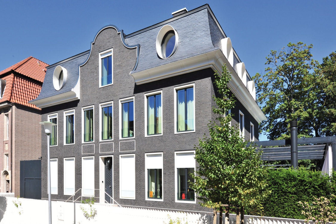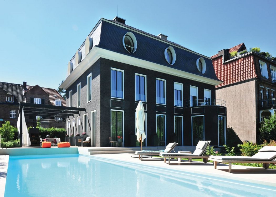 Das neue Stadthaus sollte sich sowohl in die gewachsene Struktur der Gründerzeitstraße in Münster einfügen als auch zeitgemäße Ansprüche des Bauens erfüllen. So haben die Architekten mit ihrem Entwurf einen Bogen von der historischen Gebäudesubstanz zu den modernen Elementen geschlagen. Weiß gezeichnete Konturen prägen die Kubatur des Hauses. Sie führen die Formensprache des Umfelds fort und interpretieren diese gleichzeitig neu. Symmetrien verleihen der Klinker-Fassade ein einheitliches Erscheinungsbild. Klassische Komponenten wie Treppe, Eingang, Dach und Gauben geben dem Gebäude einen selbstbewussten Charakter. Auch die verwendeten Materialien für Fassade, Terrasse und angeschlossenen Pool ordnen sich in die Optik ein: Wenige verschiedene Baustoffe spielen zusammen und verbinden sich zu einem zurückhaltenden Baukörper mit individuellem Design.