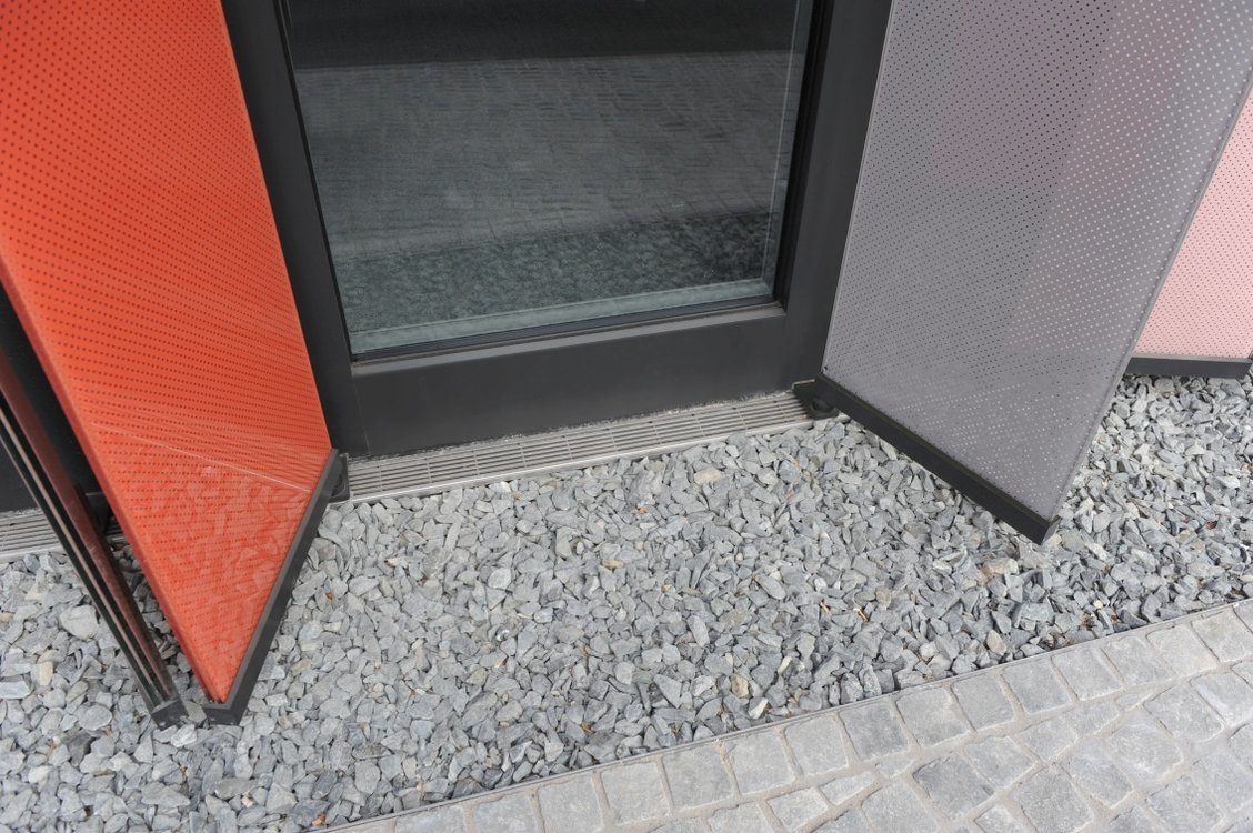 Treffpunkt für Mitarbeiter und Besucher sind die beiden Innenhöfe mit Sitzmöglichkeiten zum Verweilen. Hier wurden ca. 1.000 Quadratmeter Natursteinpflaster verlegt, dessen Struktur das organische Design der Gebäude sowie der Außenflächen aufgreift. Unter den Sitzmöglichkeiten wurden von der Richard Brink GmbH & Co. KG gefertigte Schlitzrinnen des Typs Lamina eingebaut, über die das Regenwasser in die dafür vorgesehenen Revisionskästen laufen kann. Diese Kästen, die zur Reinigung dieser Rinnen benötigt werden, fügen sich genauso ebenmäßig in die Umgebung ein, wie die Rinnen selbst. Diese optisch kaum wahrnehmbare Entwässerungslösung eignet sich besonders für die Linienentwässerung, bei der die Dränage nicht vom architektonischen Gesamtbild ablenken soll.