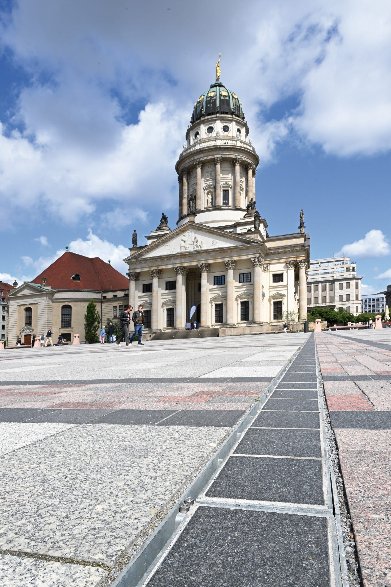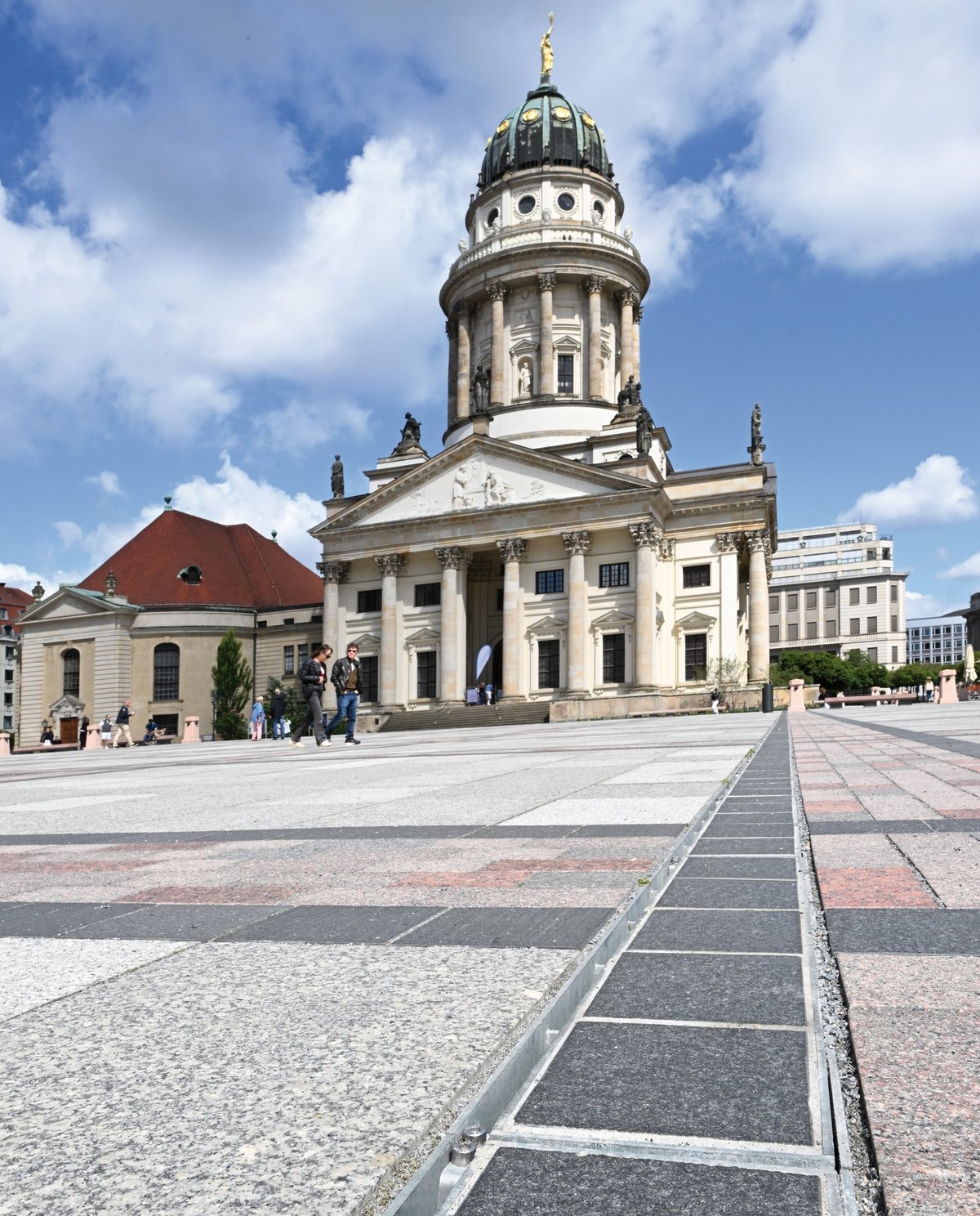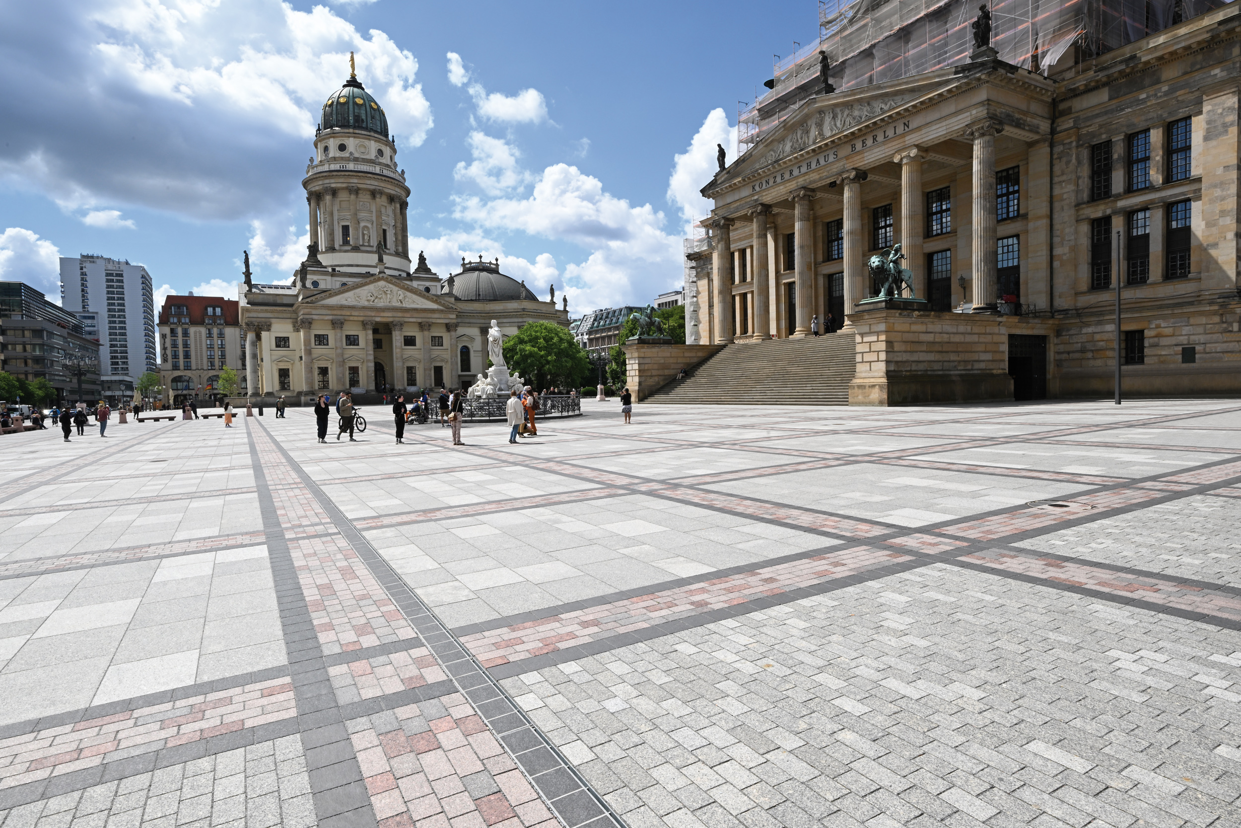 Der Gendarmenmarkt im Bezirk Mitte hat eine große Historie in der deutschen Hauptstadt. Dementsprechend wurde das neue Pflaster wieder im denkmalgeschützten Design angelegt: ein weitläufiges Karomuster, bei dem helle Quadrate dunkel eingerahmt sind. Als federführende Landschaftsarchitekten tragen die BBS Landscape Engineering GmbH aus Berlin gemeinsam mit der ASPHALTA-Ingenieurgesellschaft für Verkehrsbau mbH aus Falkensee die Verantwortung für die Ausführung samt Planung und Objektüberwachung. Wichtig bei der neuzeitlichen Interpretation des alten Stils war die Herstellung eines tourismusnahen, barrierefreien Platzes mit großzügigen Sichtachsen.
