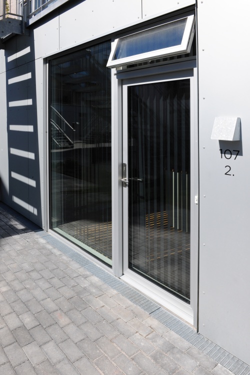 Um anfallende Niederschläge bestmöglich abzuleiten und die Fassadenbereiche der oberen Ebenen vor eindringender Feuchtigkeit zu schützen, wurden rund um die Gebäude Fassadenrinnen des Typs Stabile Air der Richard Brink GmbH & Co. KG verbaut. Insgesamt lieferte der Metallwarenhersteller 870 m seiner funktionalen Rinne aus feuerverzinktem Stahlblech. Durch ihre Einlaufbreite von 150 mm und einer Sonderhöhe von 470 mm können sie auch große Wassermengen problemlos aufnehmen. Das Produkt zeichnet sich aber vor allem durch seinen gut durchlüfteten Wandanschluss aus, der sowohl Staunässe als auch Kapillarwirkungen verhindert. Dafür sorgen sowohl großflächige Öffnungen am fassadenseitigen Bereich der Rinne als auch die hervorkragenden Auflageflächen für die Roste und der ebenso weit hervorstehende Rinnensockel. Diese halten einen ausreichenden Abstand zur Fassade und gewährleisten somit einen gut durchlüfteten Wandanschluss. Dank ihrer MAGNELIS-Beschichtung konnten die in einer Länge von je 1.000 mm gelieferten Stabile Air, wenn überhaupt nötig, von den Verarbeitern ohne weitere Nachbehandlung zugeschnitten und passgenau montiert werden.