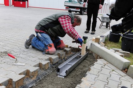 Im nächsten Arbeitsschritt haben die Verarbeiter die Seitenteile der Schwerlastrinnen mit Beton unterfüttert. Eine zusätzliche Verbindung mit dem Fundament gewährleisten Anker, die durch Einhängeverbindungen an den Außenwandungen des Systems angebracht und in den Beton gedrückt werden. Für eine stabile Einfassung der Schwerlastrinne Ferro Magna und die Einbindung in die Pflasterfläche schütteten die Handwerker weiteren Beton neben den Rinnen auf, so dass angrenzende Pflastersteine direkt in das Fundament gebettet werden konnten. Infolge des optimal angelegten Untergrunds übertragen die Schwerlastrinnen den Druck, der durch Fahrzeuge entsteht, direkt ins Erdreich. Die robuste Konstruktion sorgt langfristig dafür, dass anfallendes Wasser über die Schwerlastrinnen mit einer Einlaufbreite von 150 mm zuverlässig abfließt.