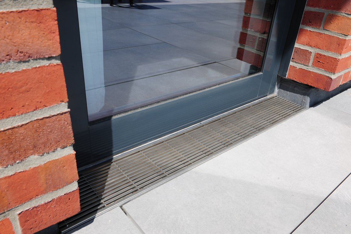 Die Verarbeiter verlegten die Rinnen passgenau in den jeweiligen Laibungsbereichen vor den Türen der längsseitigen Dachterrasse sowie einer weiteren Terrasse auf einer tiefergelegenen Ebene. Zusammen mit den Rosten erlauben die Dränagerinnen „Stabile“ einen barrierefreien Übergang. Als Abdeckung kamen entsprechend gefertigte 7 x 7 mm Längsstabroste aus Edelstahl zum Einsatz. Während sich diese auf der Dachterrasse elegant in die Umgebung ein- und die Linienführung der Profilbleche am Boden fortführen, setzen sie im Laibungsbereich des zweiten Außenbereichs einen gekonnten Kontrast zum Fassadenklinker.