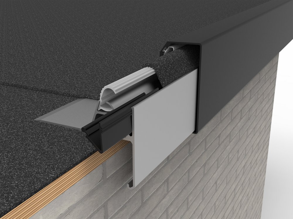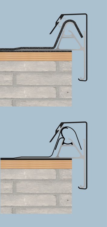 Die dreiteilige Variante „Nexum“ besteht aus einem Aluminium-Basisprofil, austauschbaren ABS-Kunststoff-Profilen zur mechanischen Fixierung von Bitumen- oder Folienbahnen sowie aufsteckbaren Zierblenden, ebenfalls aus Aluminium, mit Gummidichtungen. Die Basisprofile werden direkt am Dachrand verschraubt und die Abdichtungsbahn anschließend über das Kunststoff-Klemmprofil gelegt. Durch das abschließende Anbringen der Zierblenden, welche sich per Clip-Verbindung auf das Basisprofil aufstecken lassen, werden die Bahnen sicher und dauerhaft zwischen den Kunststoff-Klemmprofilen sowie den Zierleisten eingeklemmt.