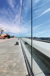 Die beispiellose Raumgestaltung reicht bis zu einer rund 800 Quadratmeter großen Dachterrasse, die einen einzigartigen Blick über die Stadt gewährt. Gläserne Balustraden grenzen die Dachfläche sicher ein, ohne den Blick auf die Weite des Panoramas zu verstellen. Ein Treppenaufgang führt von einem unterhalb der Dachfläche liegenden, offenen Innenhof eines Cafés auf die Plattform selbst, die mit Sitzgelegenheiten und einem gastronomischen Angebot zum Verweilen einlädt.