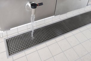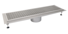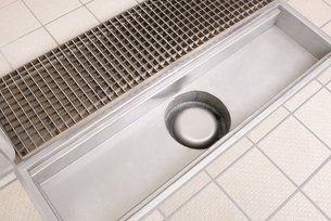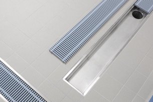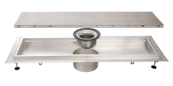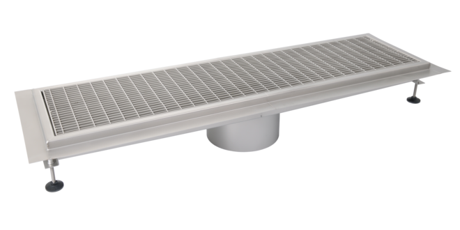 De goten hebben een inlaatbreedte van 160 mm en aansluitstukken in DN 100. Vanaf een inlaatbreedte van 250 mm kunnen aansluitstukken naar keuze in DN 100 of DN 200 worden geleverd. De geïntegreerde 110 mm of 204 mm brede vloerafvoeren zijn voorzien van een stankafsluiting en zeef. Bovendien bieden wij afvoeren met verticale of horizontale aansluitstukken, die met hun flens op de vloerplaat liggen.