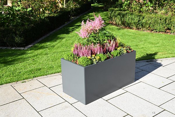 Möchten Sie Kübelpflanzen mit ausgeprägten Wurzelballen verwenden und das eingesetzte Grün vor Frost im Winter sowie Austrocknung im Sommer schützen? Für diesen Einsatzzweck sind doppelwandige Systeme wie unser Pflanzkasten Duplex Max mit innenliegenden Paneelen bestens geeignet. Sie halten die Pflanzerde auf Abstand zur Außenhülle des Kastens und bilden so eine isolierende Luftschicht. Die Varianten aus 1,5 mm starkem feuerverzinktem Stahl mit Pulverbeschichtung, Cortenstahl oder Edelstahl sind in verschiedenen RAL-, DB- und NCS-Farben erhältlich.