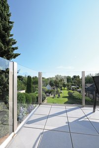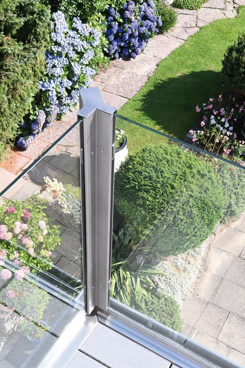 Das Grundgerüst der Geländer, innerhalb dessen sich verschiedene Fertigungsparameter variieren lassen, bilden Edelstahl-Pfosten mit Glasträgern und Halteplatten. Das Geländer wird stets an die individuellen Gegebenheiten vor Ort angepasst und ist in auskragender oder innenliegender Form, für Nischen oder als Sonderform erhältlich. Zur Auswahl stehen Höhen von 900 mm, 1.000 mm oder 1.100 mm, gemessen von der Oberkante des Bodens. Die maximale Ausladung beträgt 210 mm von der Außenkante des Pfostens bis zum Befestigungspunkt der Halteplatte. Der Hersteller gibt lediglich den maximalen Abstand zwischen zwei Edelstahl-Pfosten, abhängig von der gewählten Höhe, vor. Dieser kann nach Bedarf aber immer kleiner ausgearbeitet werden. Der optionale Handlauf ist entweder in runder Ausführung mit einem Durchmesser von 42,4 mm, in quadratischer Form in den Maßen 60 mm x 60 mm oder als Edelstahl-Abschlussprofil erhältlich. Und sogar beim verbauten Verbundsicherheitsglas (VSG) besteht die Auswahlmöglichkeit zwischen klaren oder satinierten Varianten.